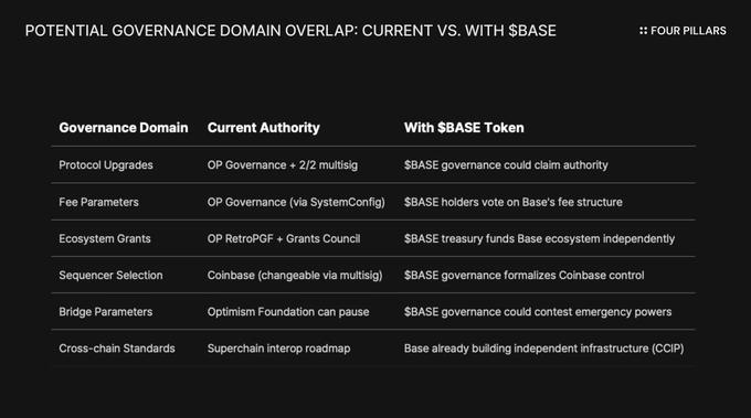 저희는 표현 방식이 내용만큼이나 중요하다고 생각합니다. 폴락은 토큰을 "거버넌스를 확장하고, 일관된 개발자 인센티브를 보장하며, 새로운 설계 가능성을 열어주는 강력한 수단"이라고 설명했습니다. 이는 결코 중립적인 표현이 아닙니다. 프로토콜 업그레이드, 수수료 매개변수, 생태계 지원금, 시퀀서 선택 등은 현재 슈퍼체인이 관할하는 영역입니다. 이러한 결정에 대한 거버넌스 권한을 가진 BASE 토큰은 옵티미즘의 거버넌스와 중복될 뿐만 아니라, 코인베이스의 경제적 지배력을 더욱 강화할 것입니다.