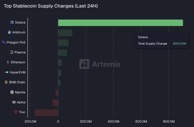 🔼 솔라나(Solana) 에 24시간 만에 9억 달러 규모의 스테이블코인 급등 주피터의 온체인 네이티브 스테이블코인 출시와 모건 스탠리의 솔라나(Solana) ETF 발행 신청 이후, 솔라나의 스테이블코인 공급량이 하루 만에 9억 달러 이상 급증했습니다.