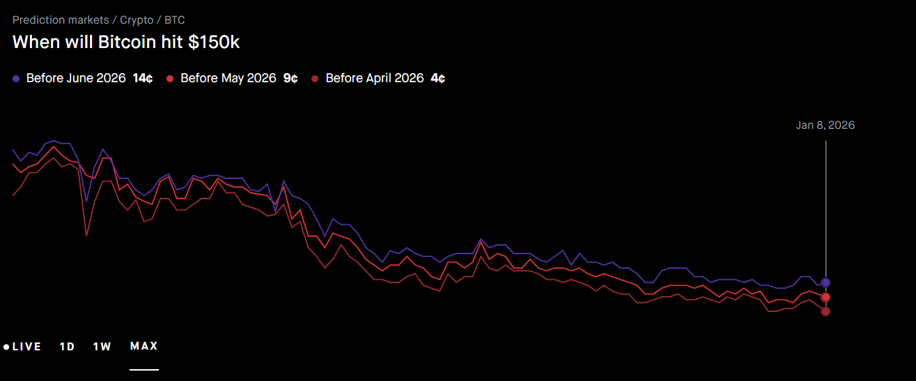 로빈후드의 예측 시장에 따르면 비트코인이 2026년 6월 이전에 15만 달러를 돌파할 확률은 현재 14%입니다.
