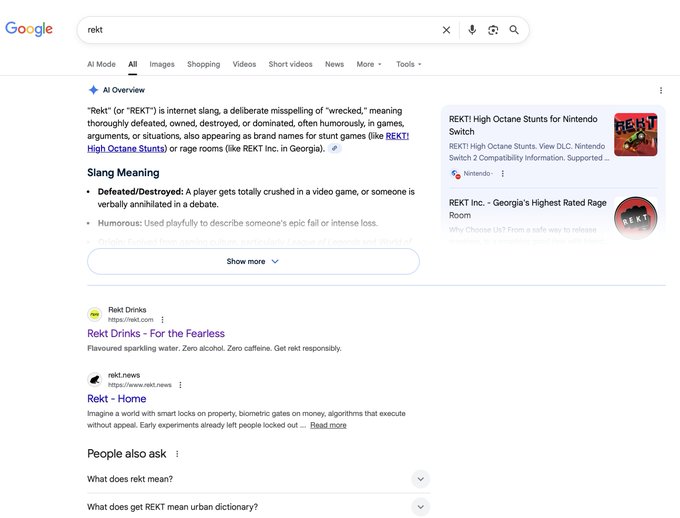 구글에서 "rekt" 검색 결과 1위는 공식적으로 @rektdrinks입니다! @osf_rekt, @iliketabz 그리고 모든 커뮤니티 여러분, SEO 랭킹 1위 달성을 진심으로 축하드립니다! 🥇