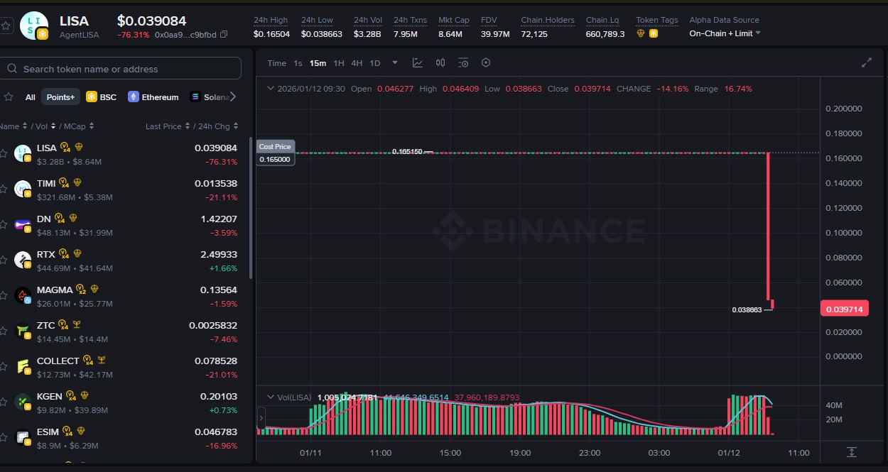 LISA는 바이낸스 알파에서 순조롭게 거래되고 있었는데, 개발자가 곧바로 문제를 일으켰습니다... (5분 만에 4번이나 발생 👀)