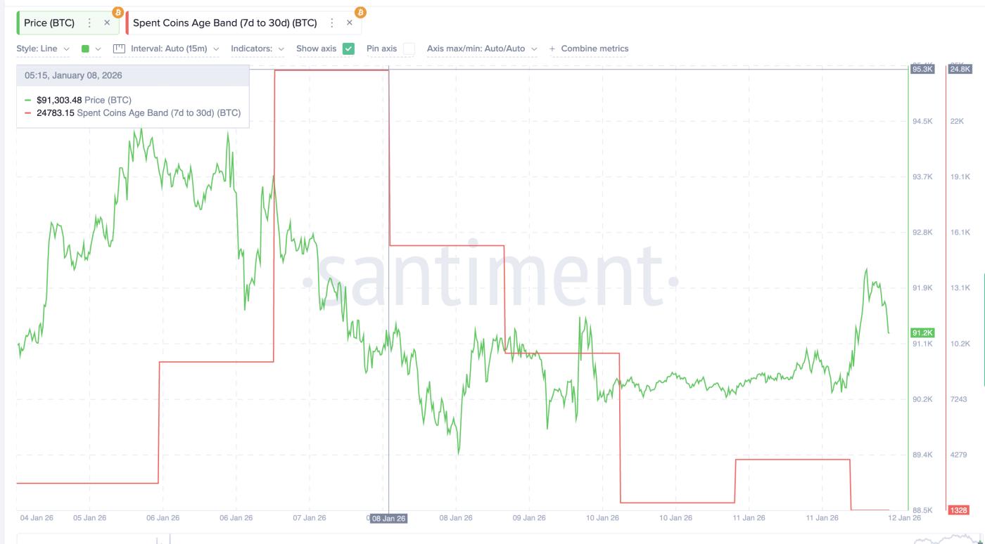 단기적인 매도 압력이 사라졌습니다. 코인 사용 기간별 활동을 보여주는 '스펜드 코인 에이지 밴드(Spent Coins Age Band)' 데이터에 따르면, 7일에서 30일 사이의 코인 사용 기간은 약 24,800 비트코인(BTC) 에서 1,328 비트코인(BTC) 로 급격히 감소하여 1월 8일 이후 95% 하락했습니다. 이는 최근 매수자들이 반등에 틈타 서둘러 매도하려 하지 않는다는 것을 의미합니다.