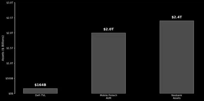 이러한 기회의 규모를 이해하려면 DeFi와 FinTech를 비교해 보는 것이 좋습니다. 현재 DeFi의 총 TVL(레버리지 가치)은 약 1,640억 달러입니다. 반면, 전 세계 모바일 핀테크 애플리케이션은 2조 달러 이상의 고객 자산을 관리하고 있으며, 상위 100개 네오뱅크만 해도 2조 4천억 달러의 자산을 보유하고 있습니다. 이에 비해 DeFi는 현재 전체 자산 규모에서 극히 미미한 부분을 차지하고 있습니다.
