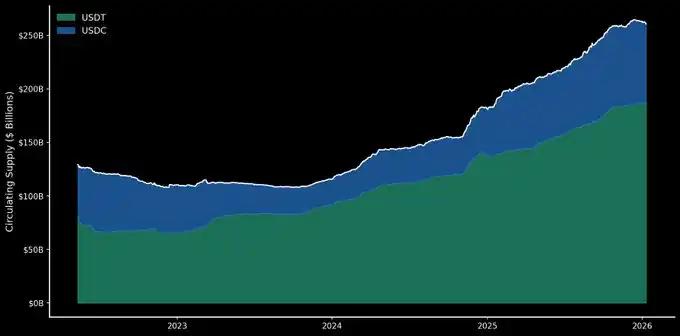 지난 한 해 동안 스테이블코인 시장은 가장 큰 수혜를 입은 분야 중 하나였습니다. 온체인 USD는 역대 신고점 경신하며 전례 없는 수준에 도달했습니다. USDT와 USDC는 꾸준히 성장하여 두 코인의 시총 합계가 2,600억 달러를 넘어섰습니다. 이는 스테이블코인 시장 규모가 전체 DeFi 시장보다 크다는 것을 의미합니다.