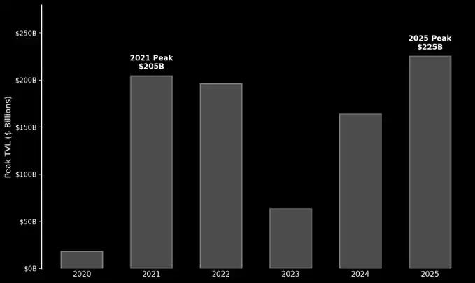 2025년 탈중앙 금융(DeFi)에 예치된 총 가치(TVL)는 사상 최고치를 경신했지만, 2021년 최고치와 비교했을 때 크게 높은 수준은 아니었습니다. 시장이 점차 진정됨에 따라, 다음 자금과 사용자는 어디에서 유입될 것인지 다시 한번 살펴볼 필요가 있습니다.