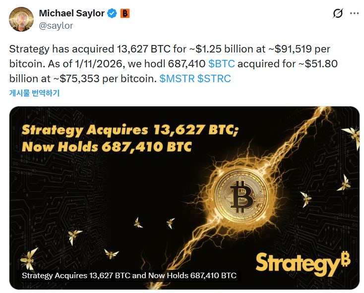 💰마이클 세일러 $BTC 추가 매수 공시 어제 마이클 세일러가 비트코인 추가 매수를 암시했었는데, 오피셜로 추가 매수를 발표했네요 13,627 개의 $BTC를 91,519$ 평단에 추가 매수 했다고 합니다. 이로써 마이크로스트래티지는 총 687,410개의 $BTC를 보유하게 되었고 총 평단은 $75,353 라고 하네요! #스트래티지 #마이클세일러 #비트코인