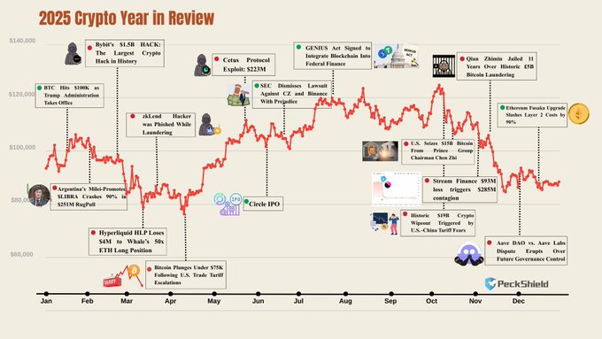 2025년은 기관 투자자들의 정점을 찍고 전례 없는 보안 문제에 직면하며 암호화폐 역사에 있어 중요한 한 해였습니다. 비트코인(BTC) 10만 달러를 돌파한 것부터 역사적인 법 집행 조치에 이르기까지, 모든 주요 사건과 가격 변동을 분석했습니다.