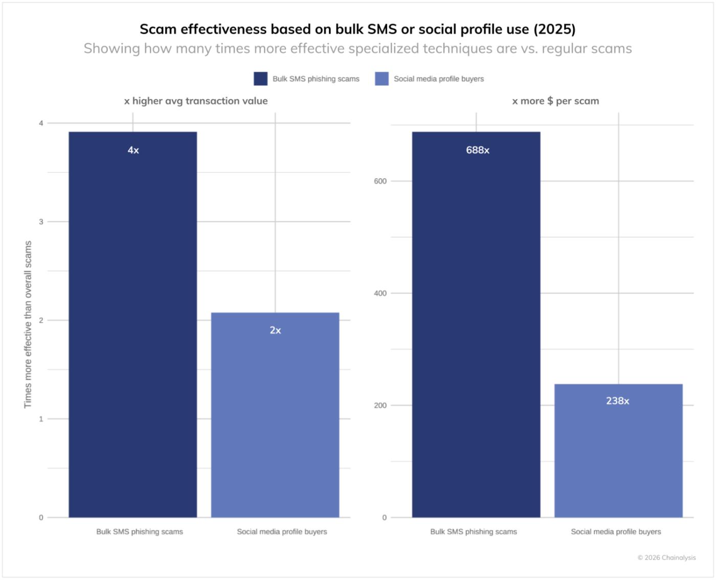 이 대규모 산업화에 의한 실해는 매우 크고, 이러한 피싱 키트를 이용한 사기는 금액 기준으로 일반 사기의 688배, 평균 거래액에서도 4배의 효과를 올리고 있다. 또한 SNS 계정을 대량 구매하고 실시하는 사기도 금액 기준으로 238배, 평균 거래액으로 2배의 효과입니다.