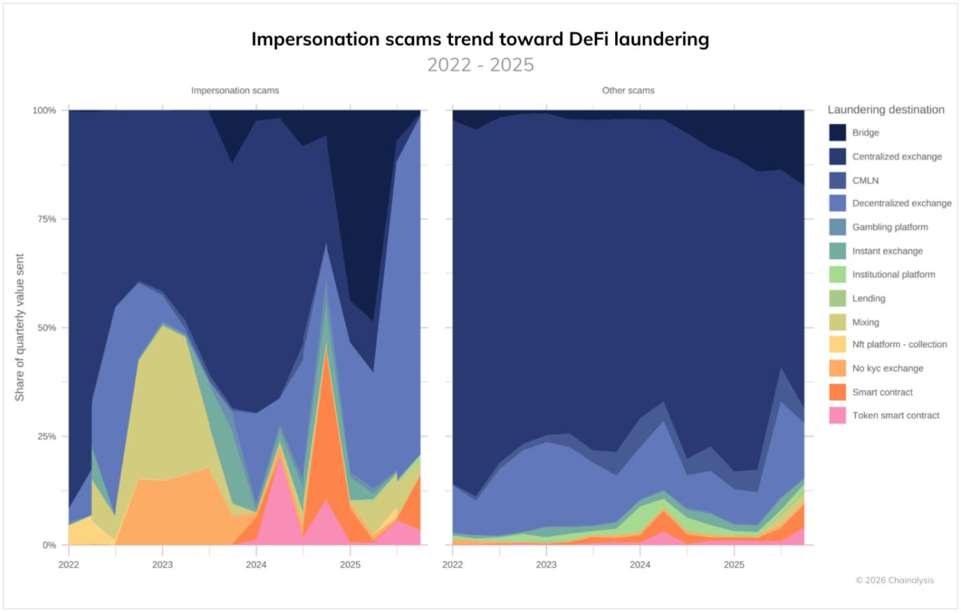 스푸핑 사기는 분산형 금융(DeFi) 생태계에 대한 의존도가 높은 독자적인 자금 세척 패턴을 가지고 있습니다. 이는 여전히 중앙집권형 거래소를 주로 이용하여 자금세정을 하는 다른 사기와는 대조적이다(이 경향은 후술하는 로맨스 사기에서도 언급된다). 흥미롭게도, 스푸핑 사기는 DeFi를 활용한 자금의 다층화로 독특한 파도를 보여주었습니다. 2024년에는 스마트 컨트랙트나 토큰 스마트 컨트랙트 경유로의 세정이 급증해, 2025년에는 그 거래량이 침착하는 한편, 브릿지 이용(2025년 전반)이나 DEX이용(2025년 후반)이라고 하는 새로운 파도가 교대로 방문했습니다. 이러한 움직임은 사기 기법이 주요 세척 포인트와 사용하는 서비스를 변경하면서 끊임없이 적응하고 있음을 보여줍니다.