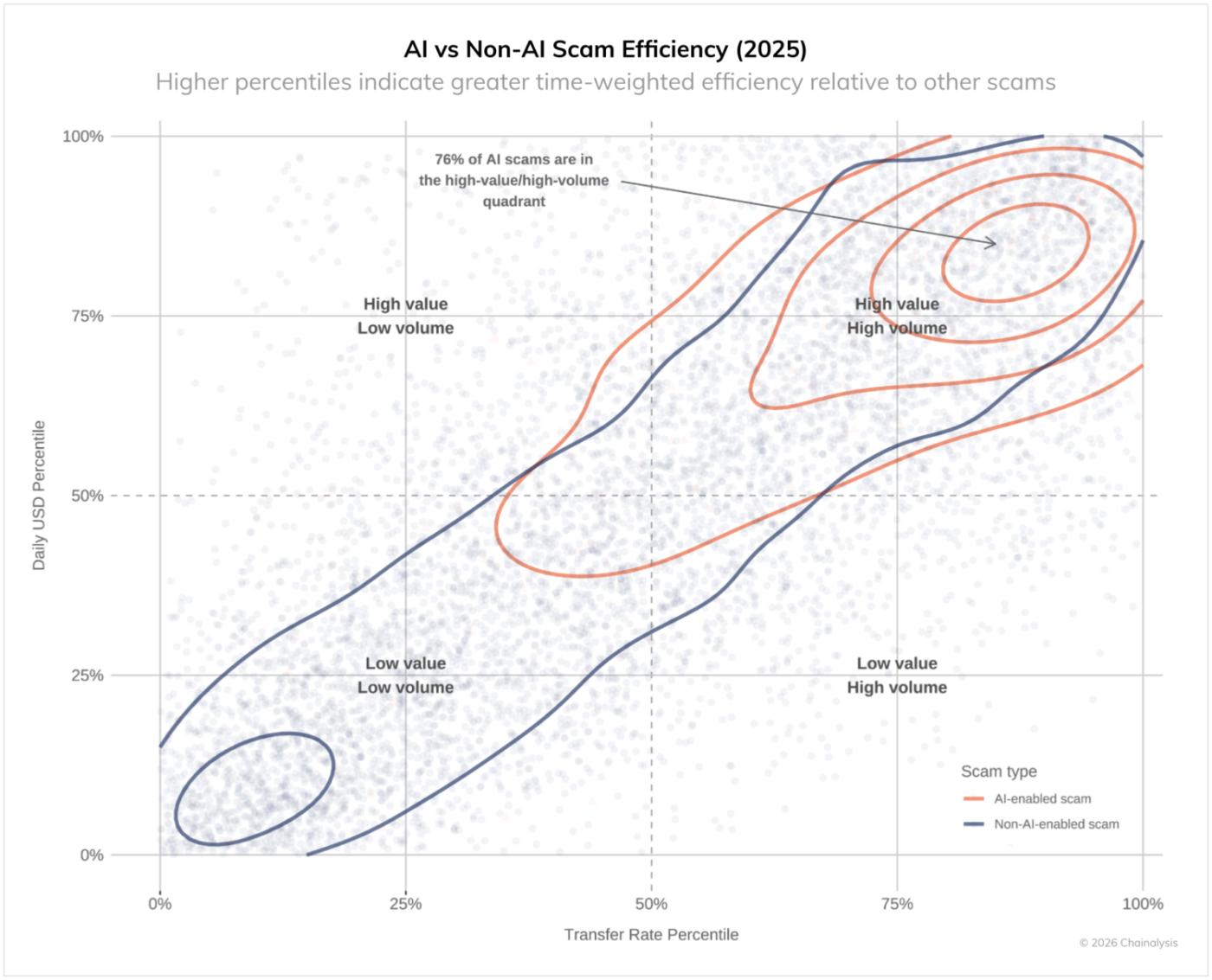 2025년 7월 JP Morgan이 발표한 보고서 에 따르면, 사기꾼은 깊은 가짜 기술과 AI 생성 콘텐츠를 활용하여 로맨스 사기와 투자 사기로 더 성공적인 스푸핑을 하는 사례가 증가하고 있다. 당사의 분석에서는 온체인에서 AI 벤더와 관련이 있는 사기의 경우, 1건당 추출액은 평균 320만 달러로, 관련이 없는 사기의 평균 71만 9,000 달러에 비해 4.5배가 되고 있습니다. 이러한 AI 관련 사기는 시간당 효율도 크게 높아지고 있습니다.