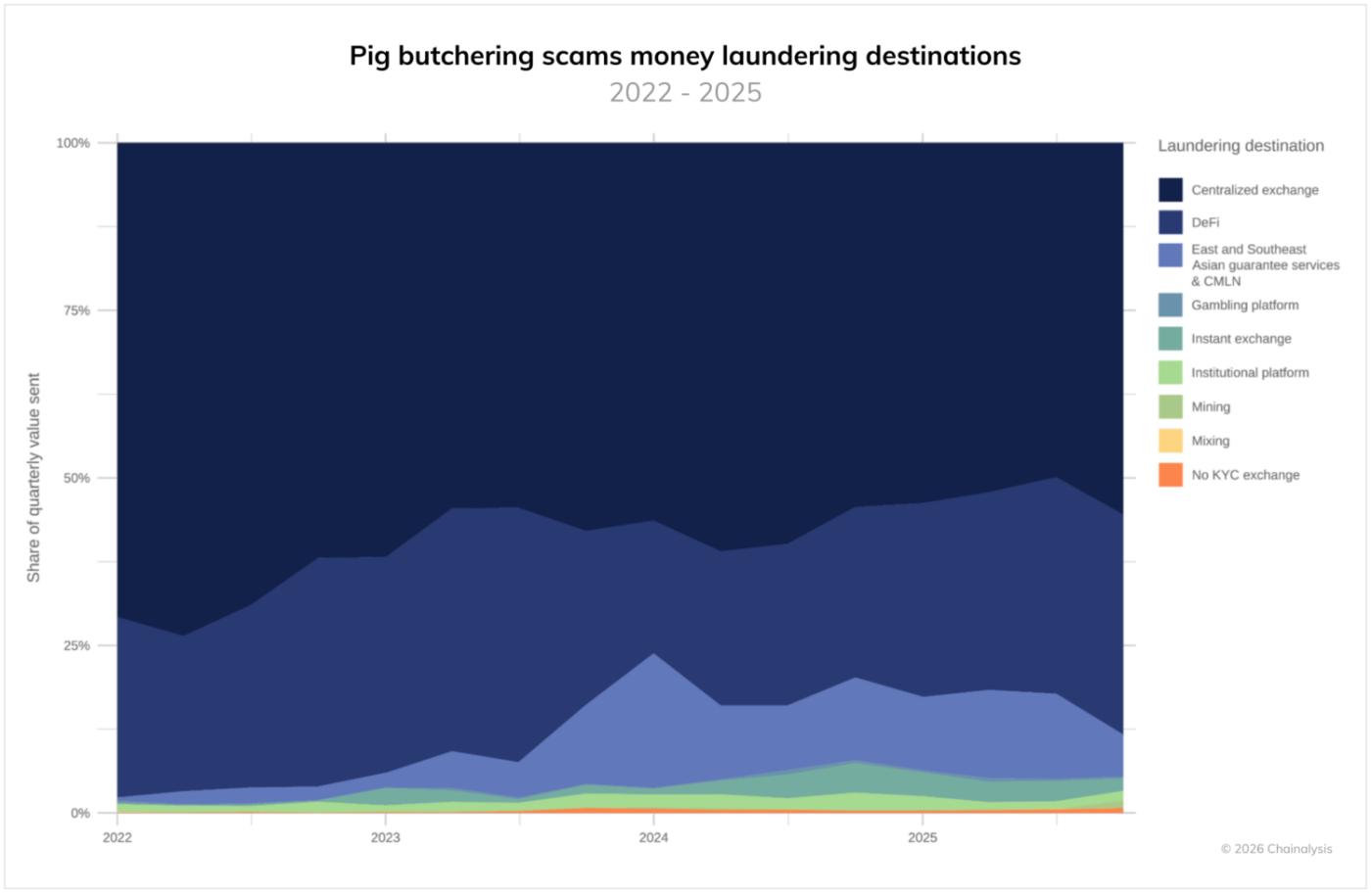 지역과의 연결은 사기 수익의 현금 출처의 분포에도 나타납니다. 2022년 1분기에는 로맨스 사기 자금 세척 중 CMLN 경유는 1% 미만이었지만, 2024년 1분기에는 20% 이상을 차지하고 2025년도 10% 이상을 유지하고 있습니다. CMLN 관련 활동의 성장은 중앙집권형 거래소에서의 자금세정 및 현금화의 감소와 일치하고 있어 거래소가 자금을 동결할 위험을 싫어하는 움직임으로 보입니다. CMLN이 장기적·지속적으로 미국·캐나다·유럽 등의 개인을 노린 로맨스 사기와 동남아시아의 중국어계 세정 서비스를 연결하고 있는 것을 알 수 있습니다.