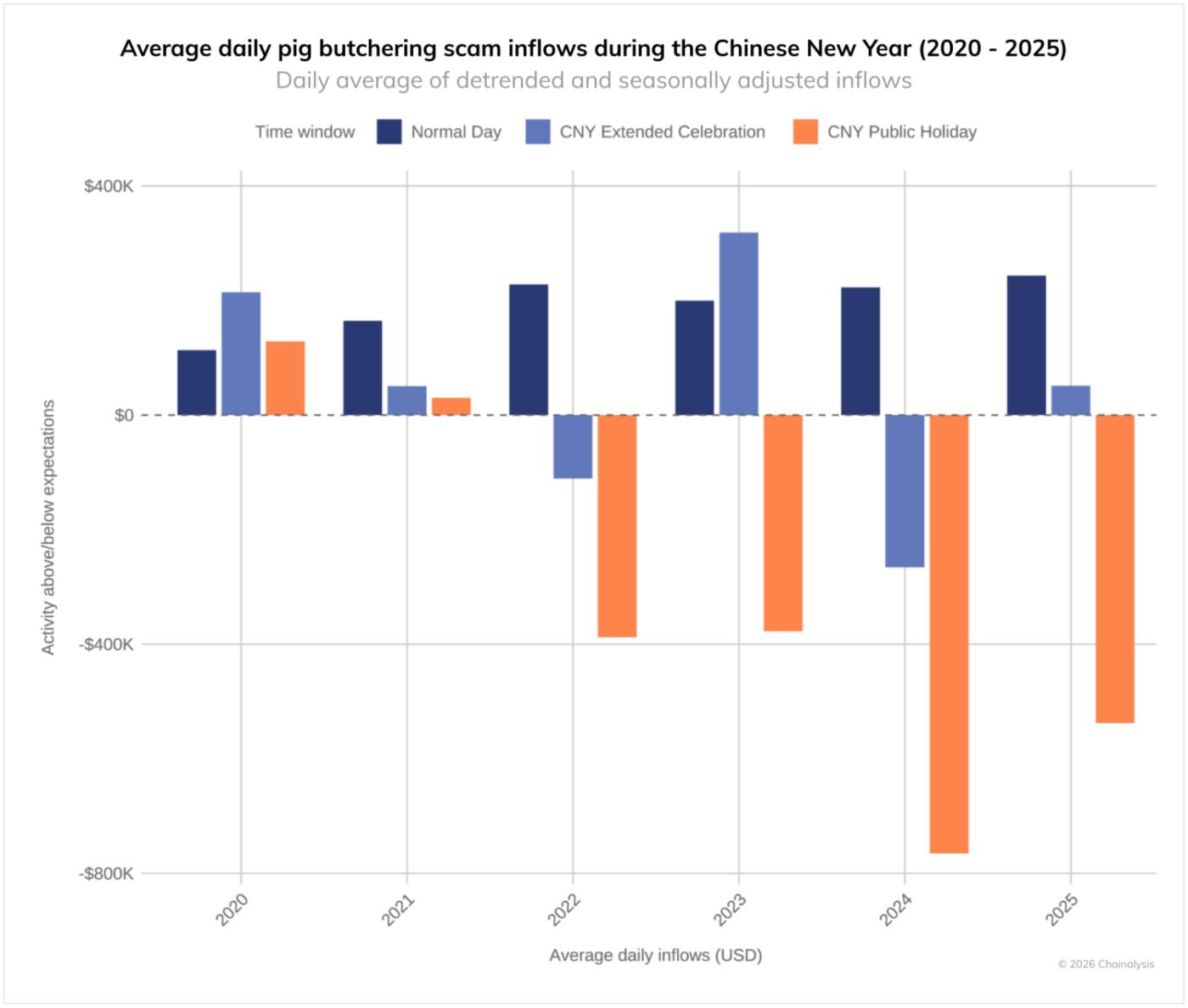 로맨스 사기 (pig butchering)의이 지역의 중심성은 사기 생태계의 특징입니다. 아래 그래프는 중국 설날(신년 15일 첫 7일)과 관련된 '휴일 효과'를 보여줍니다. 2022년경부터 Huione이 KK Park 등의 사기 거점의 자금 세정에 중심적인 역할을 하기 시작한 이후, 설날 7일에는 로맨스 사기 활동이 현저하게 감소하고 있습니다. 이 패턴은 이 지역의 액터가 사기 생태계에서 중요한 역할을 한다는 것을 시사한다.
