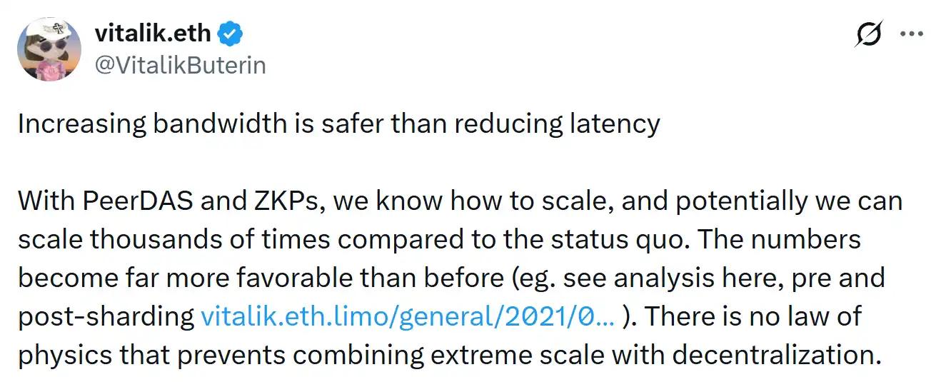 하지만 2026년 초를 기준으로 되돌아보면, 이는 기술 진화를 통해 점차 넘어설 수 있는 "설계 임계점"으로 변모하고 있는 것처럼 보입니다. 비탈릭 부테린이 1월 8일에 지적했듯이, "대역폭을 늘리는 것이 지연 시간을 줄이는 것보다 더 안전하고 관점. PeerDAS와 ZKP를 통해 이더 확장성을 수천 배까지 높일 수 있으며, 이는 탈중앙화 와 상충되지 않습니다."