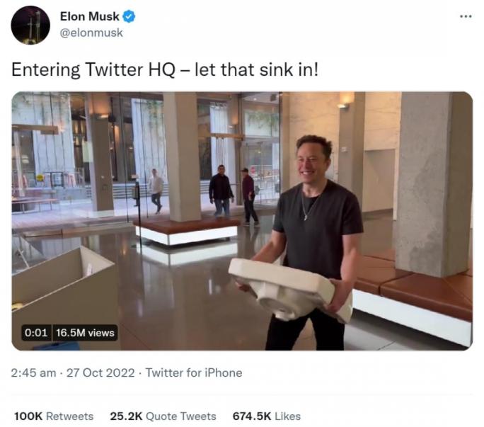 2022년 10월 27일, 머스크는 싱크대를 들고 트위터 본사 건물로 걸어 들어갔다.