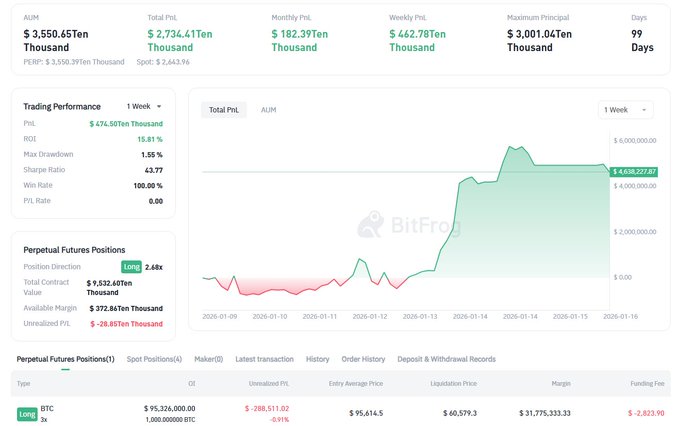 고래(사용자 ID: _2024111120230_)는 74만 달러의 수익을 내고 이더리움(ETH) 롱 포지션을 청산한 후, 3배 레버리지를 사용하여 비트코인(BTC) 롱 포지션을 빠르게 개설했습니다. 현재 이 주소는 약 9,500만 달러 포지션 의 1,000 BTC를 보유하고 있으며, 이는 매우 강력한 지속적인 거래 능력을 보여줍니다. 🐸 고래 투자자 pension-usdt.eth는 이더리움 롱 포지션으로 74만 달러의 수익을 확보한 후 곧바로 비트코인 롱 포지션을 3배로 늘렸습니다. 현재 그는 약 9,500만 달러 상당의 비트코인 1,000개를 보유하며 거침없는 시장 공격성을 보여주고 있습니다 🐸 bitfrog.io/zh-cn/hyper-trader/...…