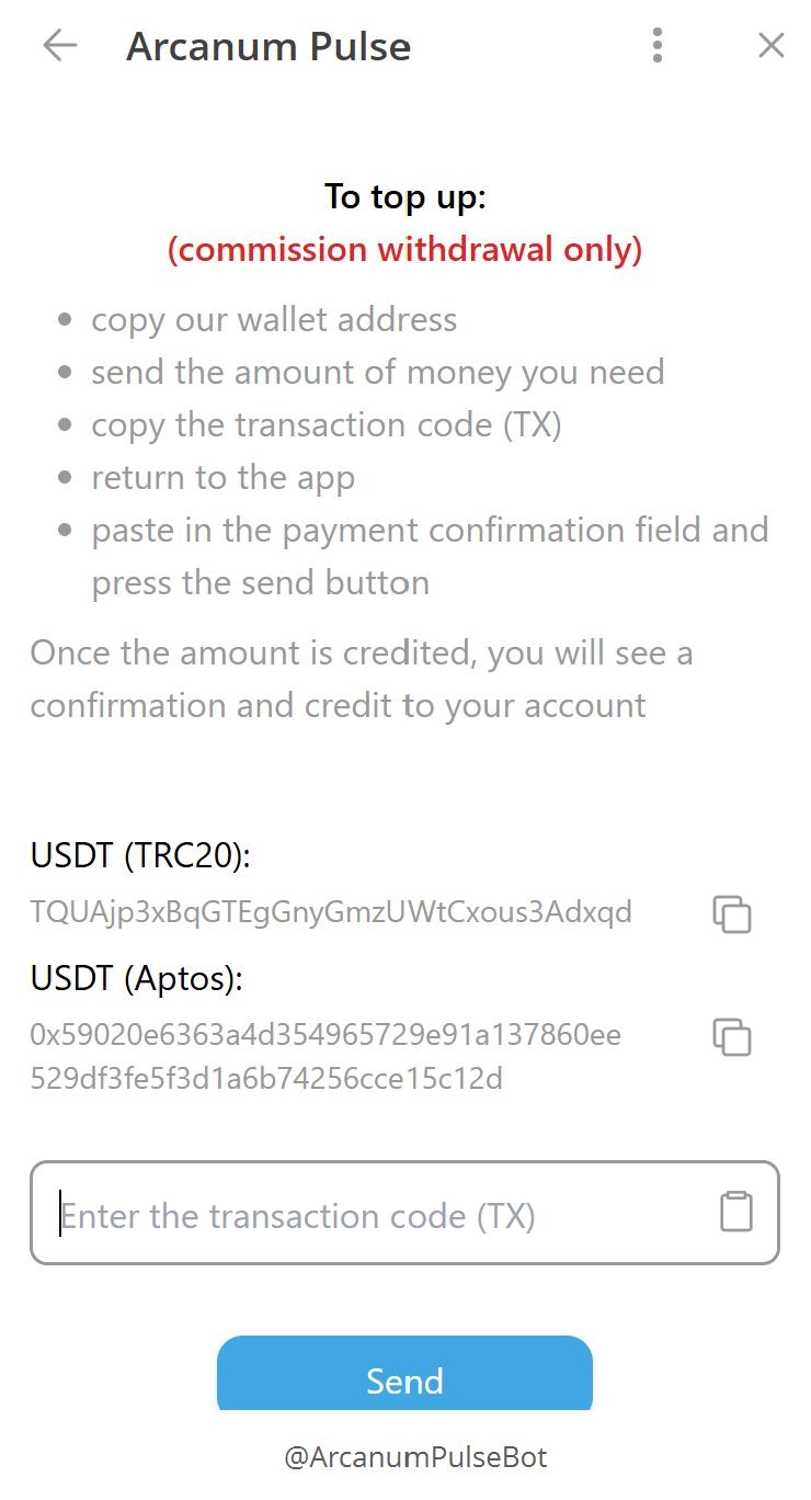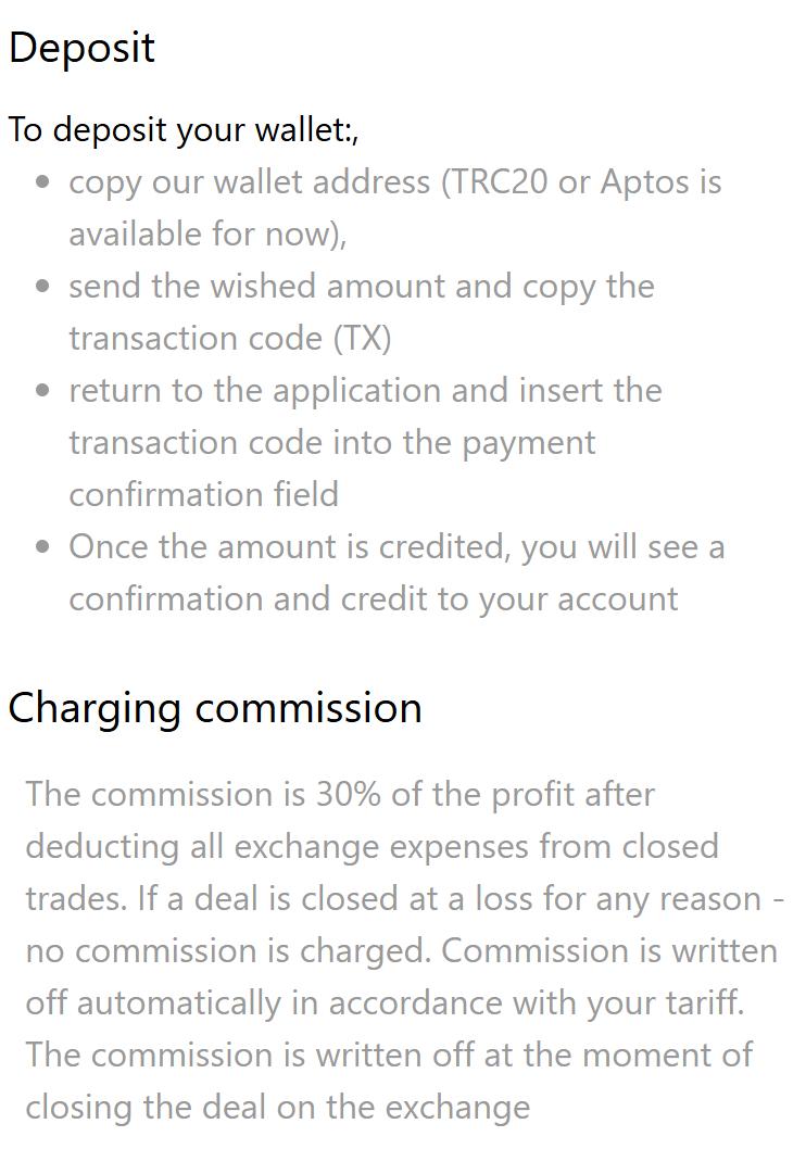 지갑에 자금을 충전하려면 사용자는 제공된 주소를 복사하고 TRC20 또는 앱토스(Aptos) 네트워크를 통해 원하는 금액을 송금한 다음 거래 코드(TX)를 애플리케이션에 직접 붙여넣어 확인해야 합니다. 플랫폼의 비용 구조는 거래 완료 후 발생한 순이익에서 거래 수수료를 공제한 금액의 30%가 수수료로 부과됩니다.