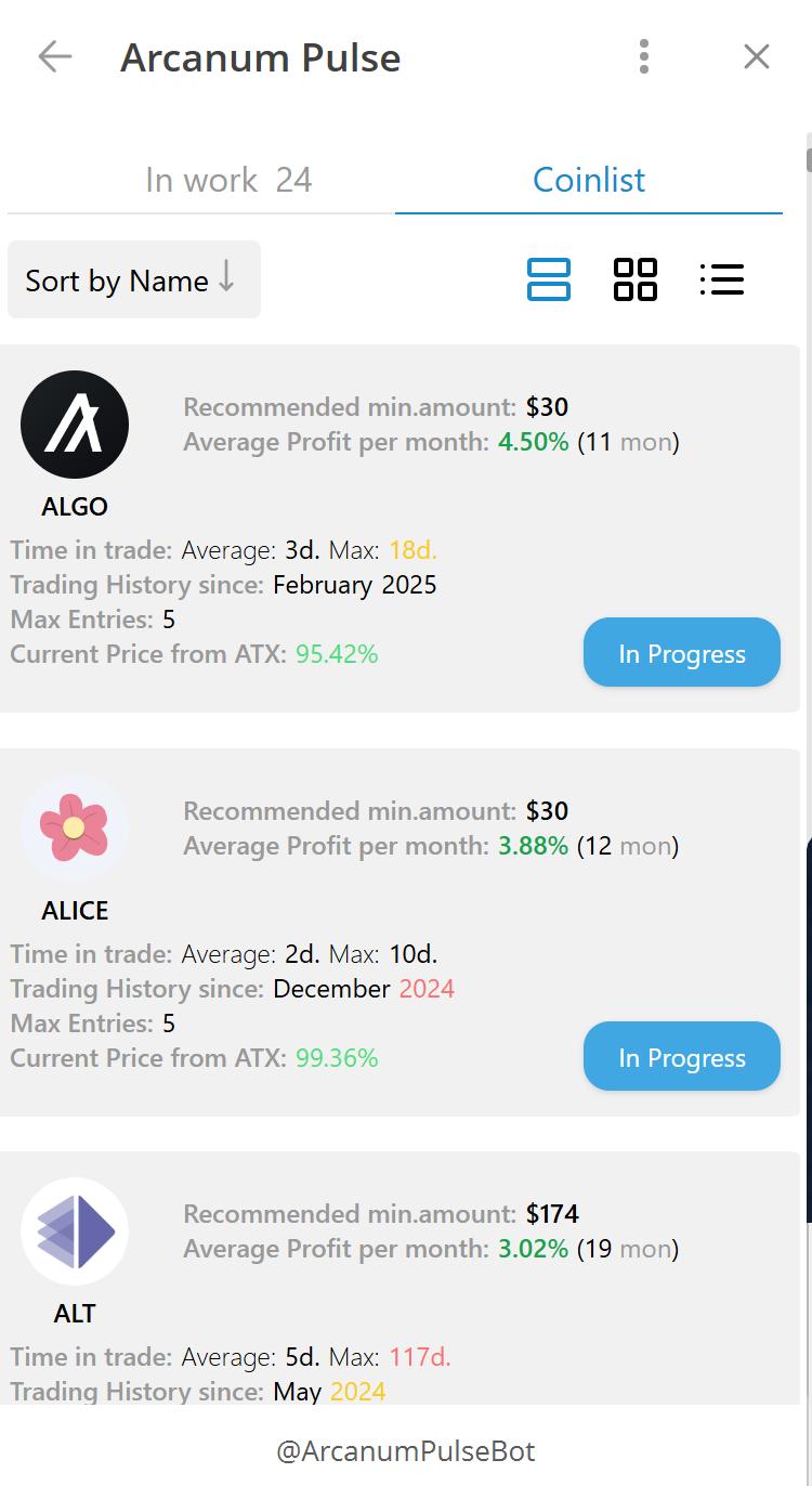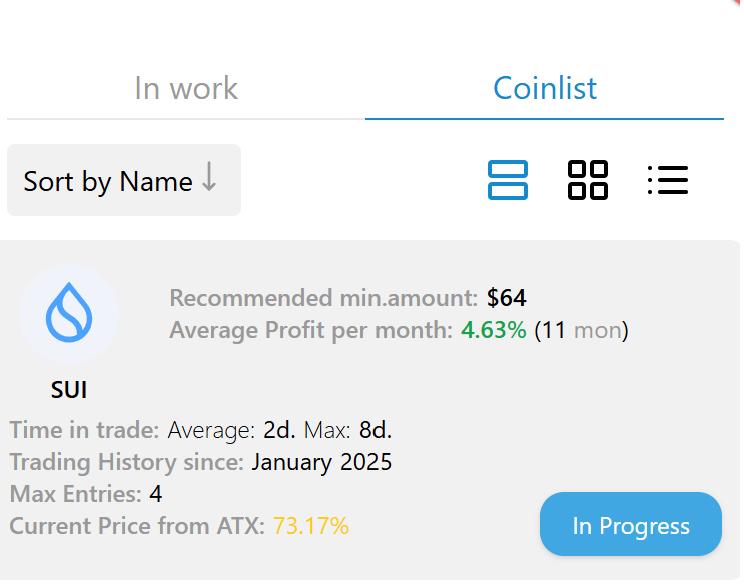 연결되면 앱은 사용 가능한 코인 목록을 보여줍니다. 저는 "진행 중" 섹션이 매우 유용하다고 생각했는데, 봇이 집중할 암호화폐를 선택하고 활성 목록으로 옮기기만 하면 됩니다. 이를 통해 포트폴리오 노출을 완벽하게 제어할 수 있습니다.