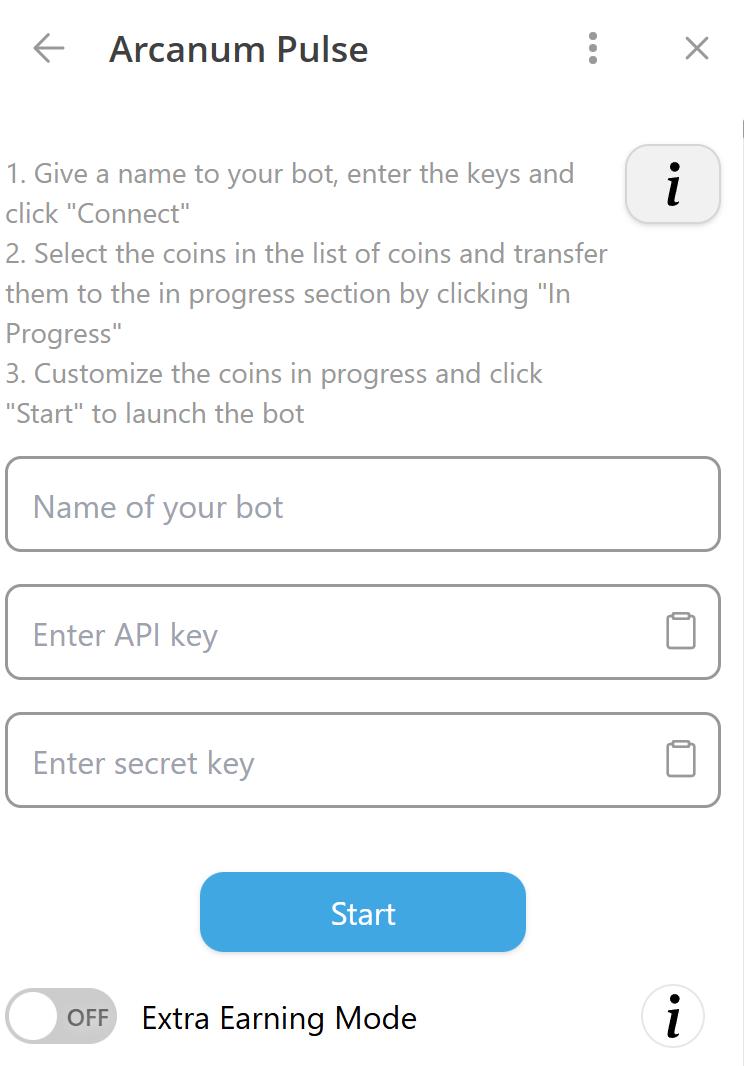 첫 화면에서는 봇에 고유한 이름을 지정해야 합니다. 여러 개의 봇을 각각 다른 전략으로 운영할 계획이라면 이 방법이 유용합니다. 이름을 지정한 후에는 API 키와 비밀 키를 입력해야 합니다.