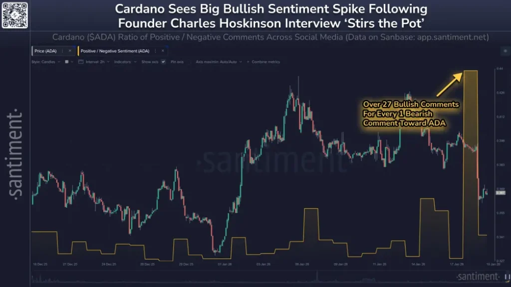 카르다노(Cardano) ( 에이다(ADA) )는 2026년 1월 19일 단기적으로 투자자들의 긍정적인 심리가 상승하는 모습을 보였으나, 이후 급격히 반대 방향으로 움직여 하락세로 전환했습니다. 이러한 움직임은 전날 창립자 찰스 호스킨슨(Charles Hoskinson) 이 진행한 라이브 스트리밍 방송과 직접적인 관련이 있으며, 해당 방송은 암호화폐 업계에 빠르게 확산되었습니다.