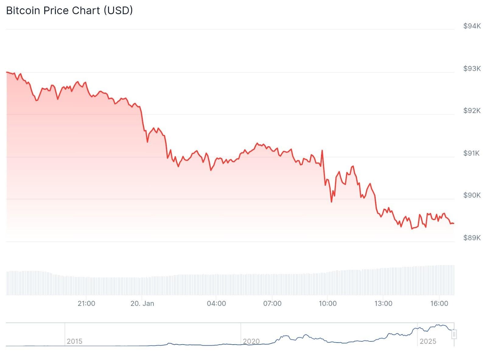 1월 20일 화요일, 암호화폐 시장은 도널드 트럼프 대통령의 그린란드 관세 위협과 관련된 무역 전쟁 우려가 심화되면서 하락했습니다.