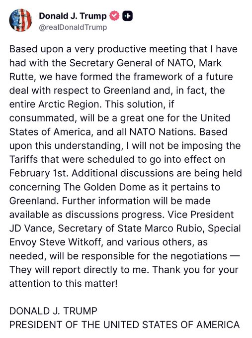 2/ 트럼프는 다보스에서 그린란드를 무력으로 점령하지 않겠다고 말했습니다.