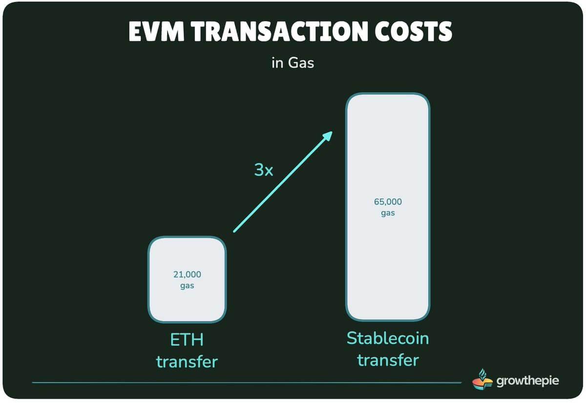 현재 이러한 저비용 네이티브 전송은 전체 이더 거래의 거의 50%를 차지합니다. 반면, ERC20 토큰을 전송하려면 약 65,000 가스가 필요하며, 스테이블코인 한 개를 전송하는 데 드는 가스 비용은 이더리움 세 개를 전송하는 데 드는 가스 비용의 합과 같습니다.