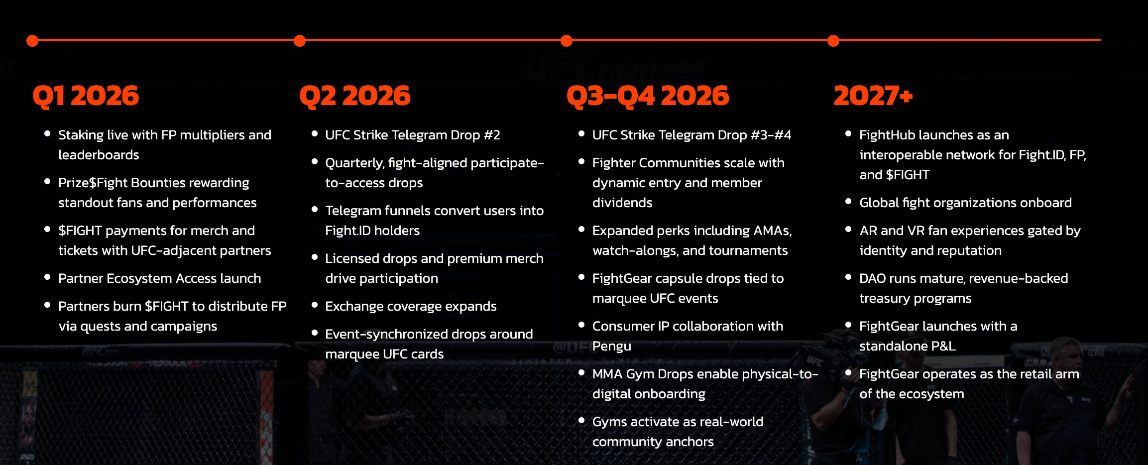 2026년 3분기~4분기 : 파이터 커뮤니티 규모 확장(동적 가입비 + 회원 수익 공유), 파이트기어 의류 협업, MMA 오프라인 체육관 파트너십 구축. 이는 생태계가 온라인에서 오프라인으로 확장되는 데 있어 매우 중요한 시기입니다.