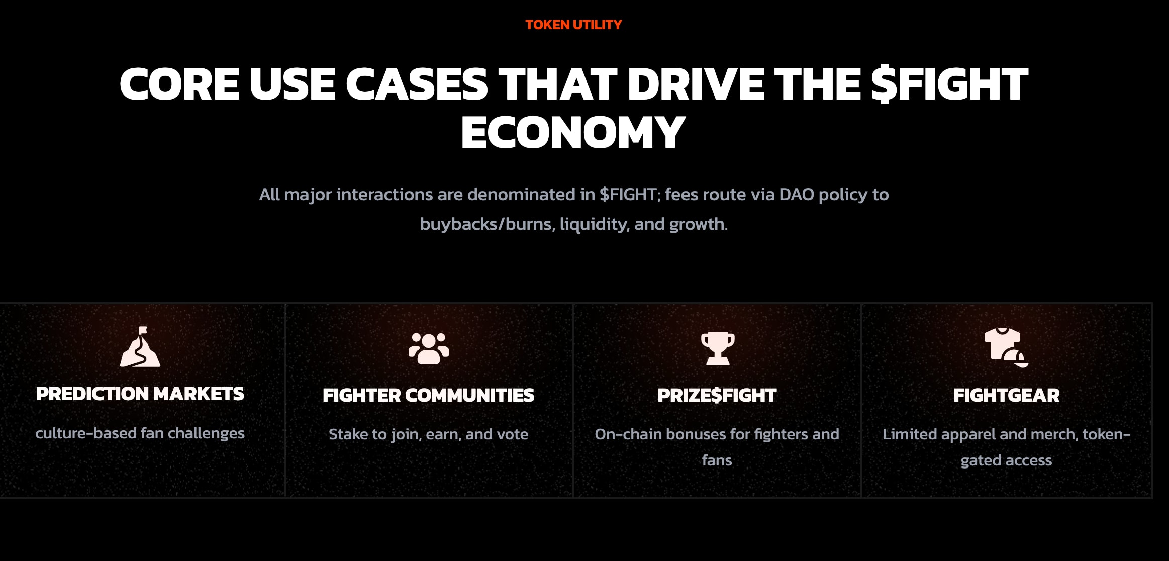 거버넌스 차원에서 $FIGHT 보유자는 재정 배분, 배출 계획 및 생태 보조금에 대한 투표권을 행사할 수 있습니다. 모든 사용 사례에서 발생하는 모든 수익은 생태 지원 및 성장을 위해 DAO 재정으로 유입됩니다.