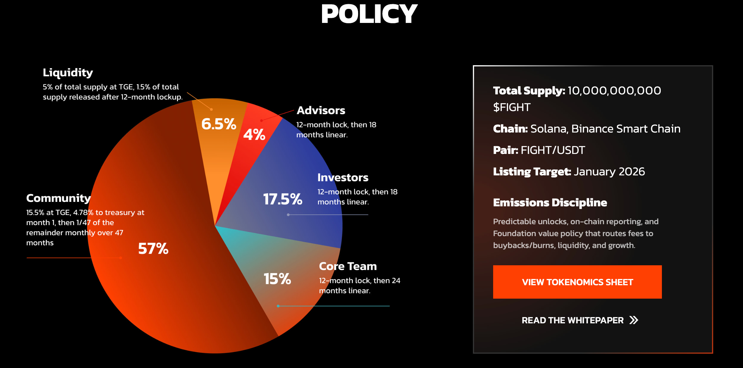 $FIGHT는 솔라나의 네이티브 토큰으로 총 발행량은 100억 개입니다. 공개 판매 가격은 0.05달러였으며, 이는 약 5억 달러의 FDV(Friction Deposit Value, 유통 예정 물량)에 해당합니다. TGE(Temporary Generating Exchange) 시점의 유통량은 약 20%로 추정됩니다.