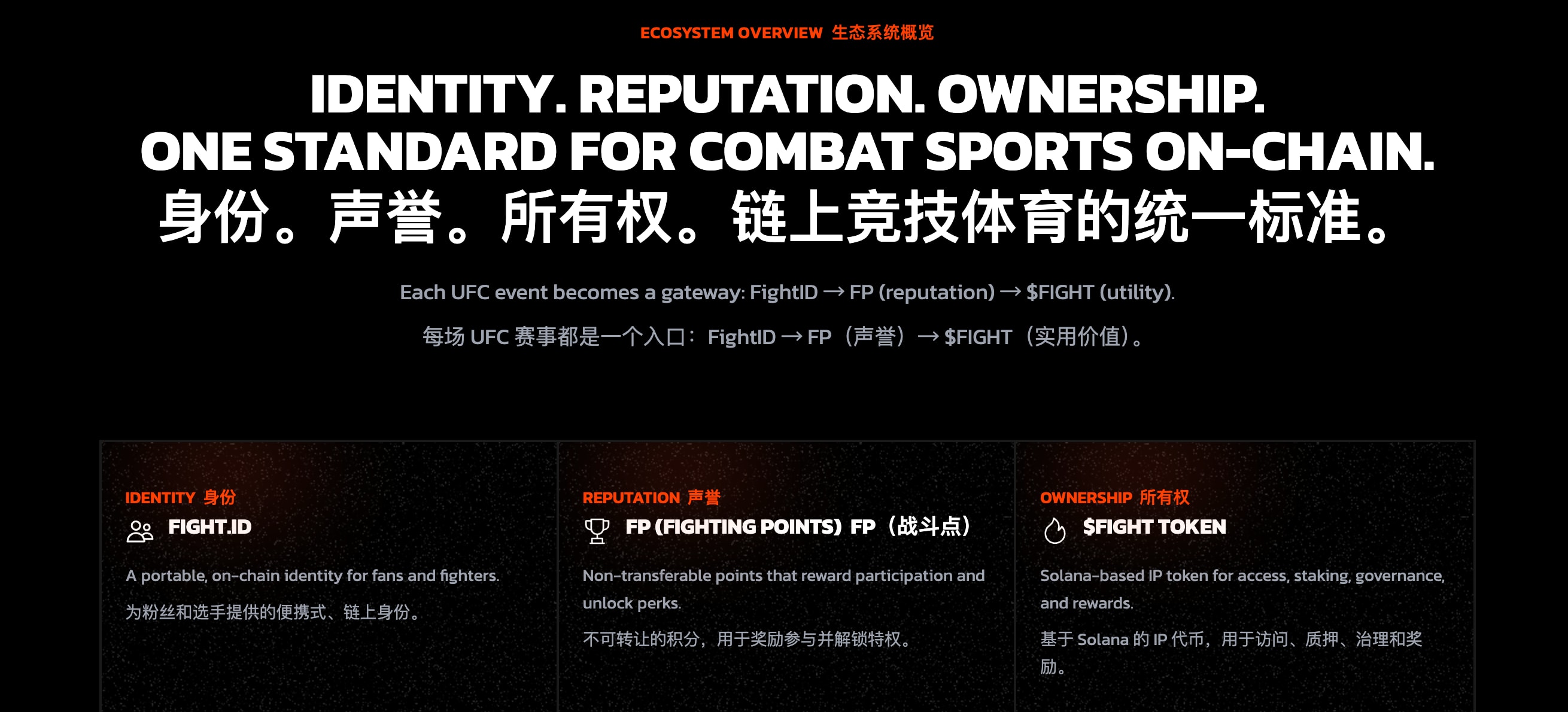 중간 단계는 FP(Fight Points, 파이트 포인트)라는 평판 점수 시스템입니다. FP는 구매, 판매 또는 양도할 수 없으며, 오직 활동 참여를 통해서만 획득할 수 있습니다. 경기 관람, 경기 결과 예측, 디지털 수집품 구매, 커뮤니티 활동 참여 등을 통해 FP를 얻을 수 있습니다.