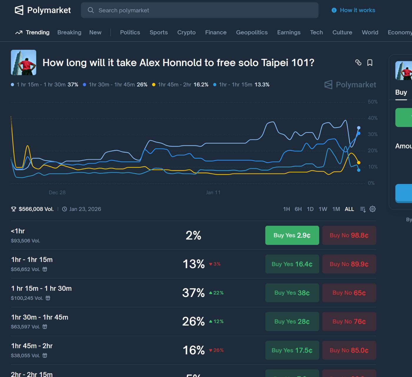 1월 21일 현재, 시장의 총 거래량 31만 달러를 넘어섰습니다. 가장 인기 있는 예상은 알렉스 혼놀드가 1시간 15분에서 1시간 30분 사이에 등반을 완료할 것이라는 예측으로, 참가자의 37%가 이 예측에 동의했습니다. 두 번째로 인기 있는 예상은 1시간 30분에서 1시간 45분 사이로, 전체 베팅의 20%를 차지했습니다.