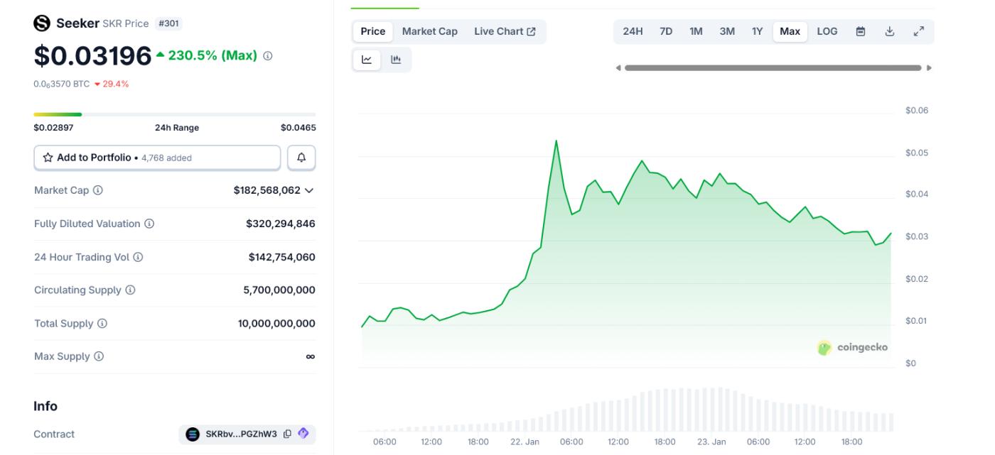 Seeker의 SKR 토큰 출시 이후 가격 차트. 출처: CoinGeckoSKR이 왜 그렇게 급격하게 상승했을까요?