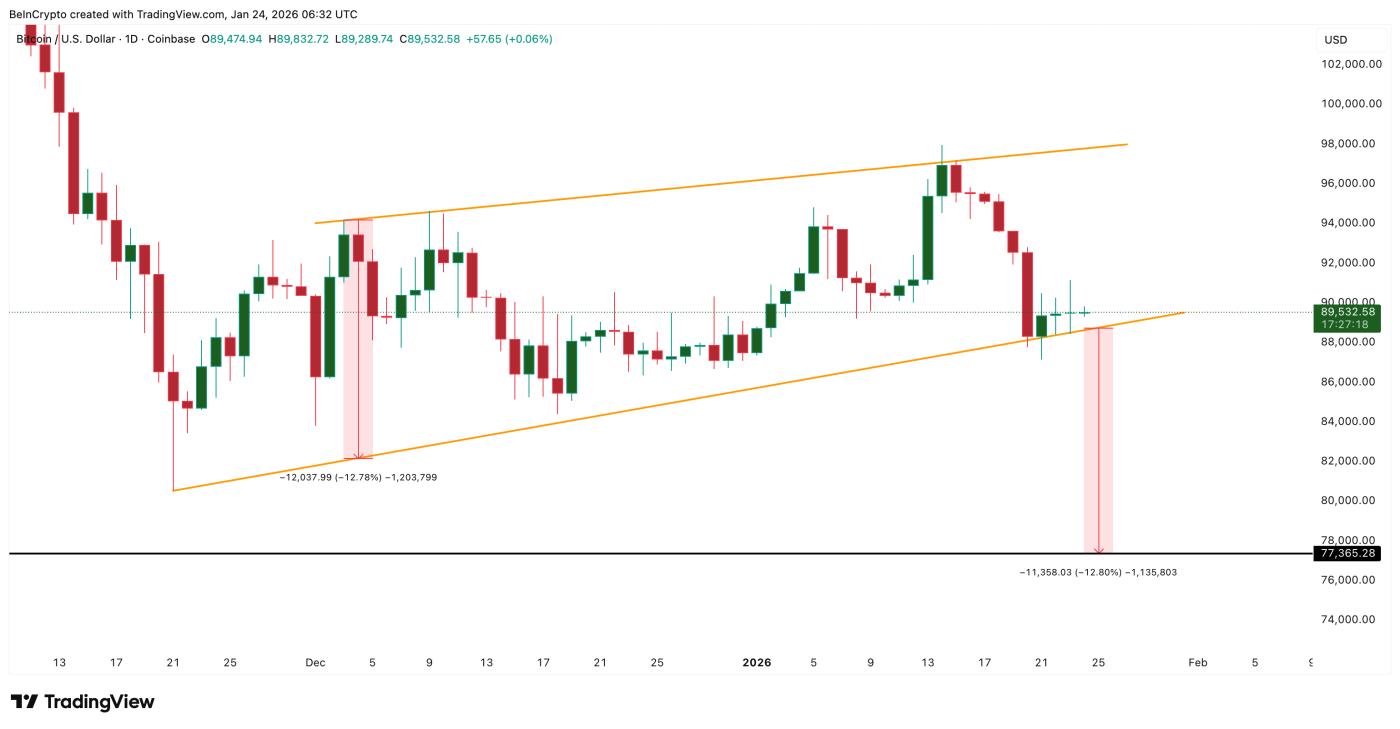 비트코인이 88,500달러 아래로 마감하면(약 1% 하락), 상승 쐐기형 지지 영역 아래로 다시 떨어질 것입니다. 이 경우, 그 아래의 지지 영역들이 빠르게 재시험될 가능성이 높습니다.