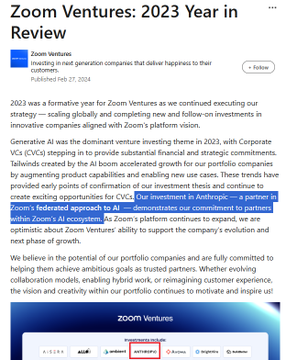 $ZM는 최고의 앤트로픽 투자 기회입니다. 줌은 2023년 앤트로픽 시리즈 C 투자에 약 41억 달러의 기업 가치로 5,100만 달러를 투자했을 가능성이 높습니다. 세쿼이아는 3,500억 달러로 평가했습니다. 85배? 희석 후에도 줌은 앤트로픽에 수십억 달러 규모의 지분을 보유할 수 있습니다. 주가는 2021년 이후 80% 하락했습니다. AI의 승자입니다. 앤트로픽 IPO는 언제쯤 할까요?