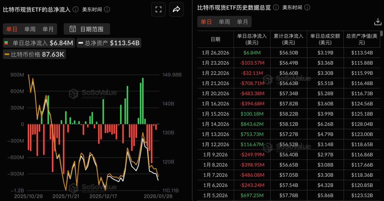 SoSoValue 데이터에 따르면 어제(1월 26일 미국 동부 시간) 비트코인 현물 ETF에는 총 684만 2,700달러의 순유입이 있었습니다.
