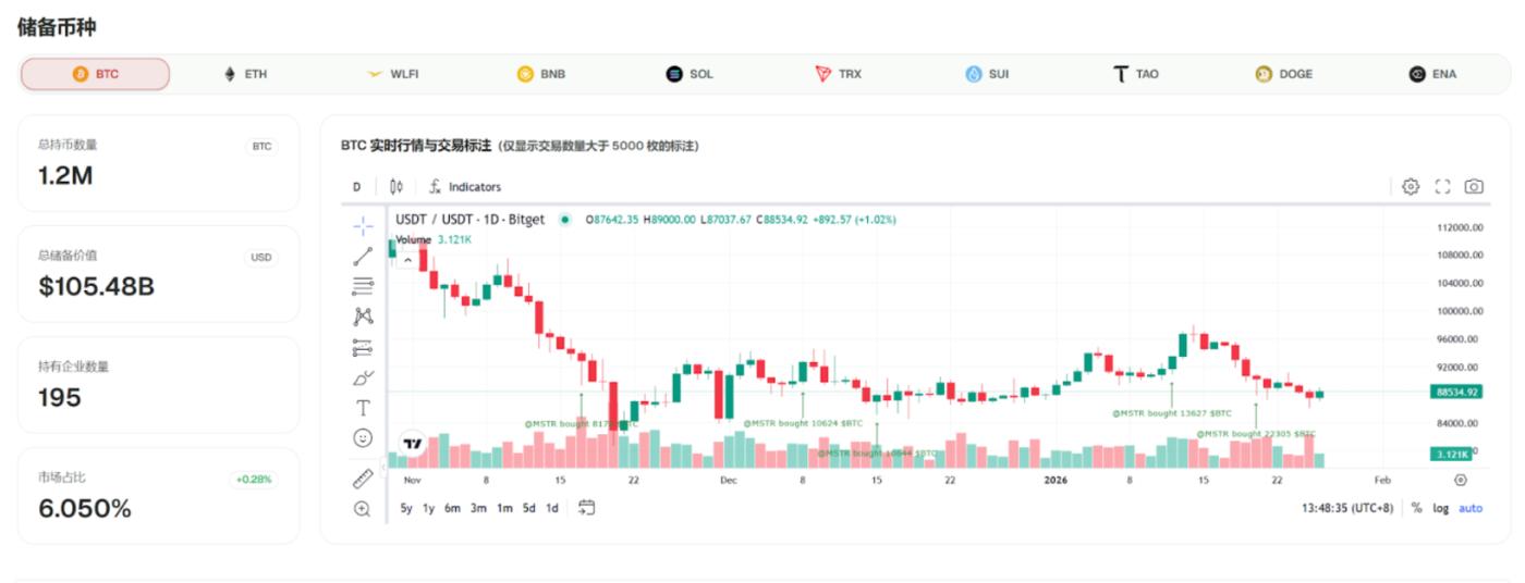 CoinFound 데이터에 따르면 현재 상장 기업 195곳이 총 1,204,469 BTC를 보유하고 있으며, 이는 전체 비트코인 공급량의 6.05%에 해당합니다. 그중 Strategy Inc(MSTR)는 712,647 BTC(이전 집계 대비 2,932 BTC 증가)를 보유하고 있어 상장 기업 전체 포지션 의 59.17%를 차지합니다.