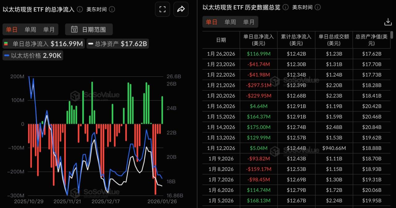 SoSoValue 데이터에 따르면 이더 현물 ETF는 어제(1월 26일, 미국 동부 시간) 총 1억 1700만 달러의 순유입을 기록했습니다.
