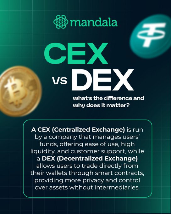중앙화 거래소(CEX) 와 탈중앙화 거래소(DEX)? 거래하기 전에 차이점을 알아두세요. 🧠 ✔️ 중앙화 거래소(CEX) – 중앙 집중식, 사용 편의성, 높은 유동성, 기업에서 관리. ✔️ 탈중앙화 거래소(DEX) – 탈중앙화, 사용자 제어, 스마트 계약을 통한 거래. 작동 방식을 이해하면 더 현명한 암호화폐 투자를 할 수 있습니다. http:/mandala.exchange에서 안심하고 거래하세요. #만달라익스체인지 #암호화폐기초 #CEXvsDEX #웹3 #블록체인