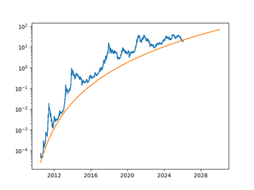 이는 2022년 7월 1일에 계산된 비트코인(BTC)/GOLD 0.01 분위수 파워 커브 적합도입니다. 이러한 분석을 확장하여 "미래에 비트코인(BTC)/GOLD가 이 추세선 위에 있을 확률이 99%이다"라고 주장하는 경우가 흔합니다.