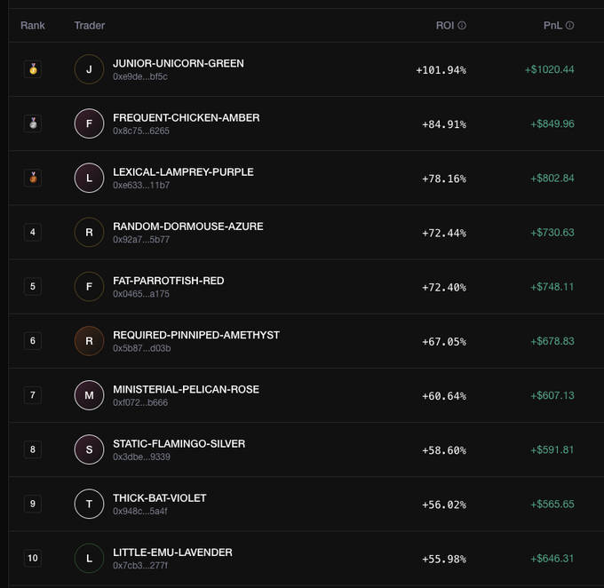 Ventuals PnL 트레이딩 대회 상위 10위 수상자 여러분, 축하드립니다! 총 상금 $USDH 달러가 Hyperliquid 지갑으로 지급되었습니다.
