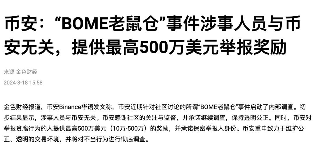 3. 내부자 거래: 공개되지 않은 시장 정보를 이용하여 불법적인 이익을 취하는 내부자 거래 행위. 거래소 직원이나 관계자가 중요한 시장 동향에 대한 사전 정보를 얻어 선제적으로 매수 또는 매도함으로써 막대한 이익을 얻는 경우입니다. 예를 들어, 신규 토큰 출시나 주요 발표 전에 토큰을 매수 또는 매도하는 행위가 이에 해당합니다. 올해 특정 거래소 에 최단 시간 상장된 BOME(Book of Meme) 프로젝트가 거래소 직원의 내부자 거래 의혹으로 언론의 주목을 받았습니다. 거래소 가 공식 성명을 발표하기 전, 한 계좌에서 약 230만 달러 상당의 SOL을 클레임 0.0074달러에 3억 1400만 개의 BOME을 매수했습니다. 이후 BOME이 거래소 거래소 상장되자 가격이 1500% 이상 급등했습니다. 거래소 는 내부 조사를 진행했지만, 거래소 과는 무관하다고 결론지었습니다.
