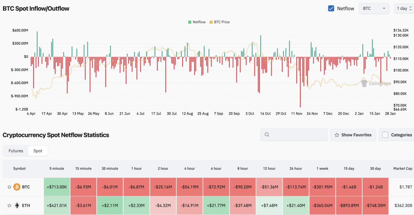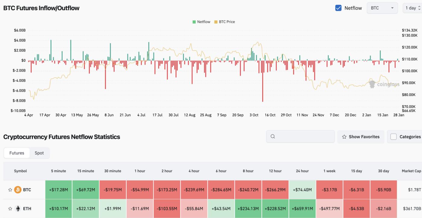Coinglass의 현물 포지션 데이터는 지속적인 순유출을 보여주고 있으며, 뚜렷한 반전 패턴은 나타나지 않고 있습니다. 선물 계약과 현물 시장 모두에서 자금 유입은 불규칙적이며, 확신을 나타내는 데 필요한 지속성이 부족합니다.