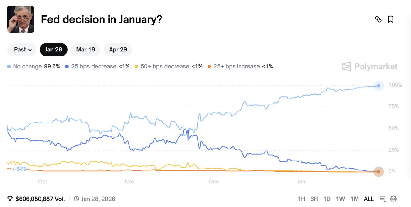 시장은 연준이 오늘(1월 28일) 회의에서 금리를 인상하지 않을 것이라고 거의 확신하고 있으며, 데이터 또한 99.6%의 확률로 이를 뒷받침합니다.