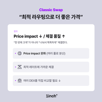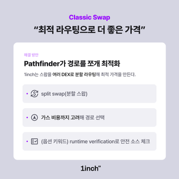 1inch Classic Swap: 최적 라우팅으로 더 좋은 가격 1inch Classic Swap은 DEX마다 흩어진 유동성/가격 차이를 한 번에 해결하기 위해, Pathfinder가 최적 경로를 자동 탐색·분할 라우팅해 더 좋은 체결을 만들어줍니다. 📕 1inch Pathfinder에 대해 더 알아보기 : blog.1inch.com/new-pathfinder-...…