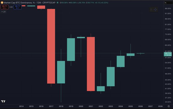 그런 다음 비트코인(BTC) 시장 점유율 차트를 보면 점유율이 *5년 연속* 상승하고 있음을 알 수 있습니다.
