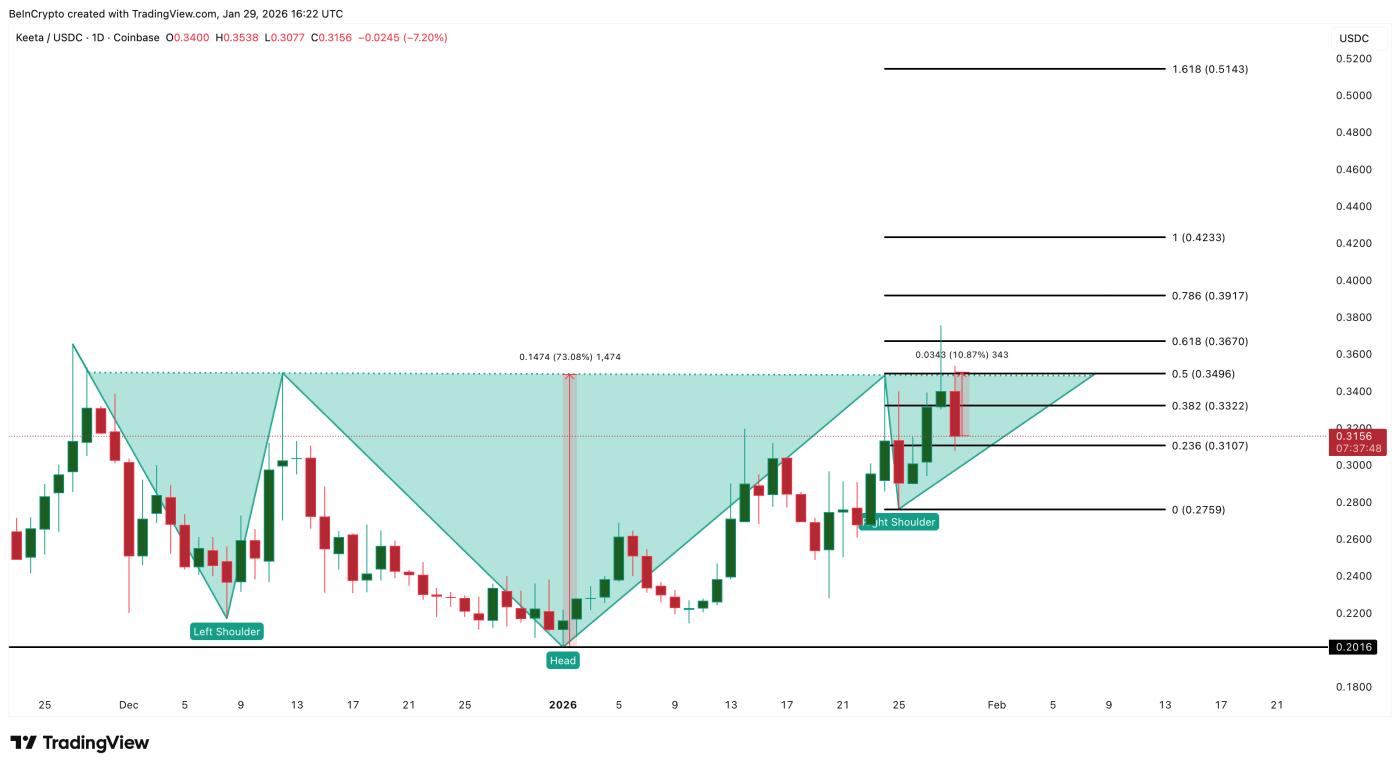 KTA 고래: 난센(Nansen)KTA 가격 차트는 현재 대형 매수자들의 움직임을 보여주고 있습니다. 키타(Keta)는 상승세 지속에 앞서 자주 나타나는 역헤드앤숄더 패턴을 형성하고 있습니다. 넥라인은 약 0.34달러 부근에 위치하고 있으며, 현재 가격은 약 0.30달러이므로 돌파 트리거는 현재 가격보다 약 10% 높은 수준입니다.