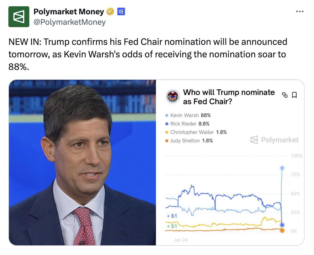 예측 시장은 이러한 변화를 빠르게 반영했습니다. 폴리마켓에서 워쉬의 지명 가능성은 약 30%에서 95%로 급증한 반면, 이전 선두주자였던 블랙록의 릭 리더의 지명 가능성은 급락했습니다.