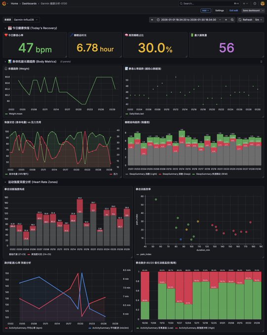 가민 스마트워치의 시각화 기능이 너무 조악해서 직접 만들었습니다. 파이썬으로 데이터를 스크래핑하고, 인플럭스DB에 저장한 다음, 그라파나를 이용해 시각화했습니다.