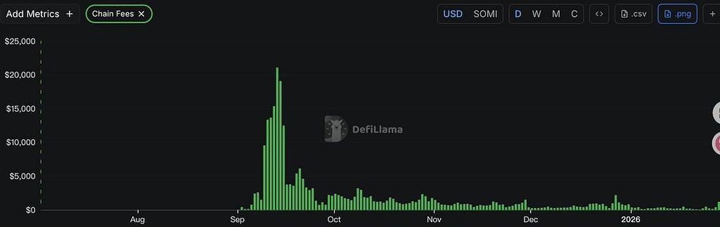 - 온체인 활동 급감: 일일 거래 수수료가 약 300달러까지 떨어져 과거 최고치에서 크게 하락했으며, 이는 사용자 참여가 거의 전무하고 프로젝트 활용도가 매우 낮음을 나타냅니다.