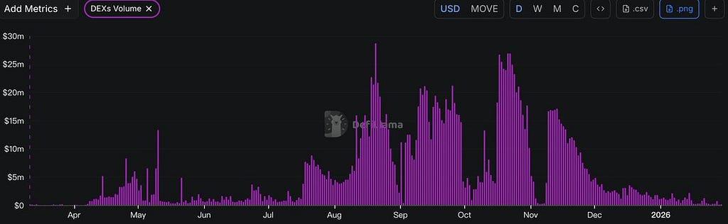 - 시장 흡수 능력이 심각하게 부족함: MOVE 토큰의 일일 평균 거래량은 약 60만 달러에 불과합니다. 시장 유동성이 부족하여 향후 출시될 토큰을 효과적으로 흡수하지 못하고 있으며, 이로 인해 상당한 매도 압력이 발생하고 있습니다.